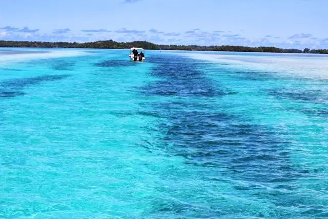 ▍德国水道是德国人用炸药在此处炸出一条可供运补船只经过的水道,于是海水就出现了深深浅浅的颜色,最深的地方也就两米。在长满珊瑚礁的海面上可明显看到一条蓝色的长形水道。当快艇飙过水道,就可以看见中间深色湛蓝,两侧青翠浅绿两种不同颜色的海面,这里也是魟鱼和众多鱼群聚集地方。如今已成为帕劳的另一标志性海标,帕劳的七色海就在此,相传此处海域,能够看到七种不同的海水颜色。