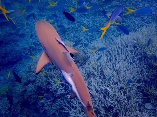 ▍鲨鱼城的区域在一个无人岛的沙滩前,此处的鲨鱼都是黑鳍鲨,这种鲨鱼没有攻击性,性格温顺,不过还是会让浮潜在水面上的小伙伴们心潮澎湃。